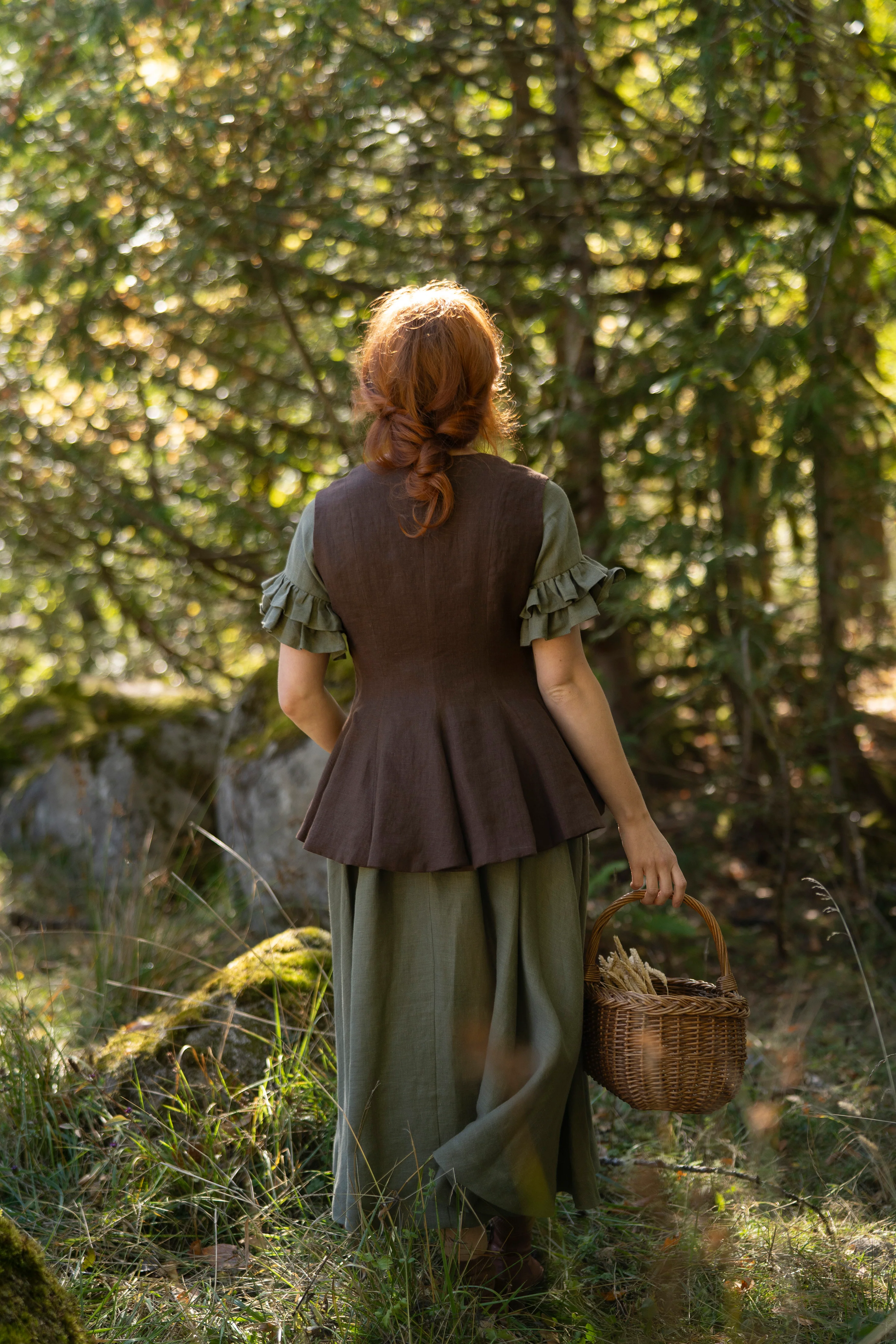 Layer your look with this historically inspired vest. With a flattering square neckline, tapered waist, and gorgeous flounces you can achieve an 18th century silhouette effortlessly! This piece features large linen buttons and useable pockets.