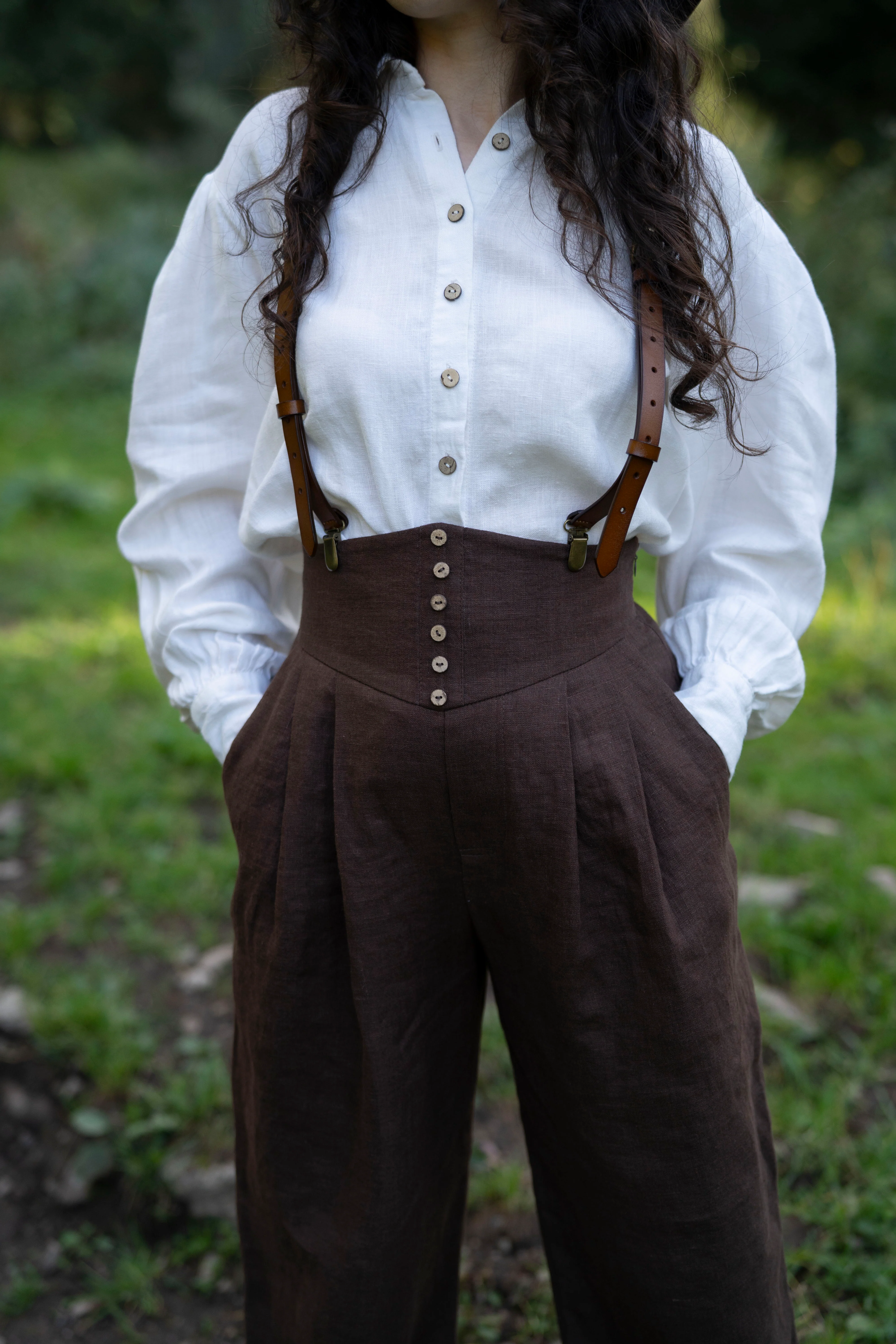High-waisted corset-style pants with pleats and an adjustable waistband at the back, featuring side pockets, a tapered fit, and decorative buttons.