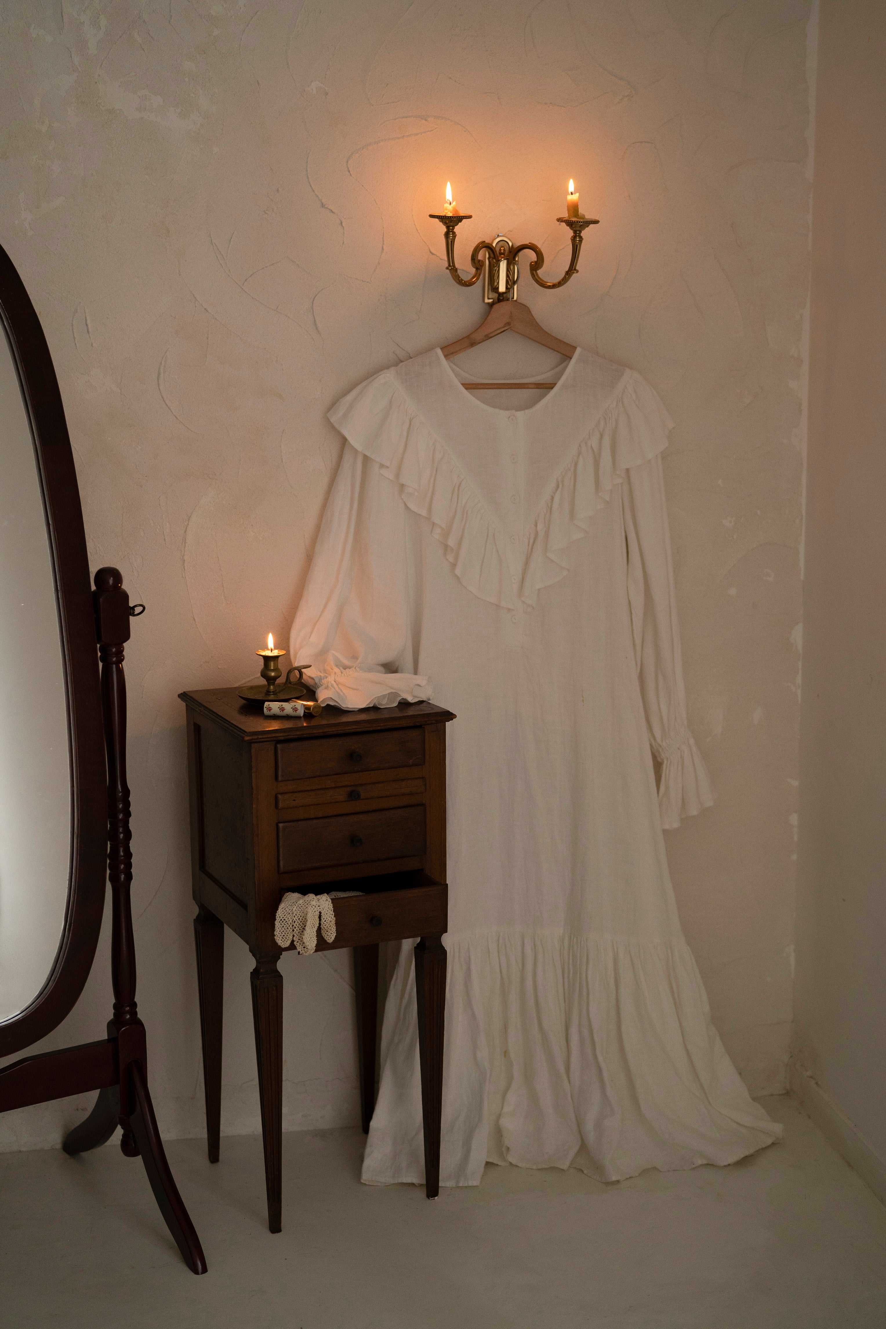 Comfortable white linen nightgown is specially created for cozy nights.