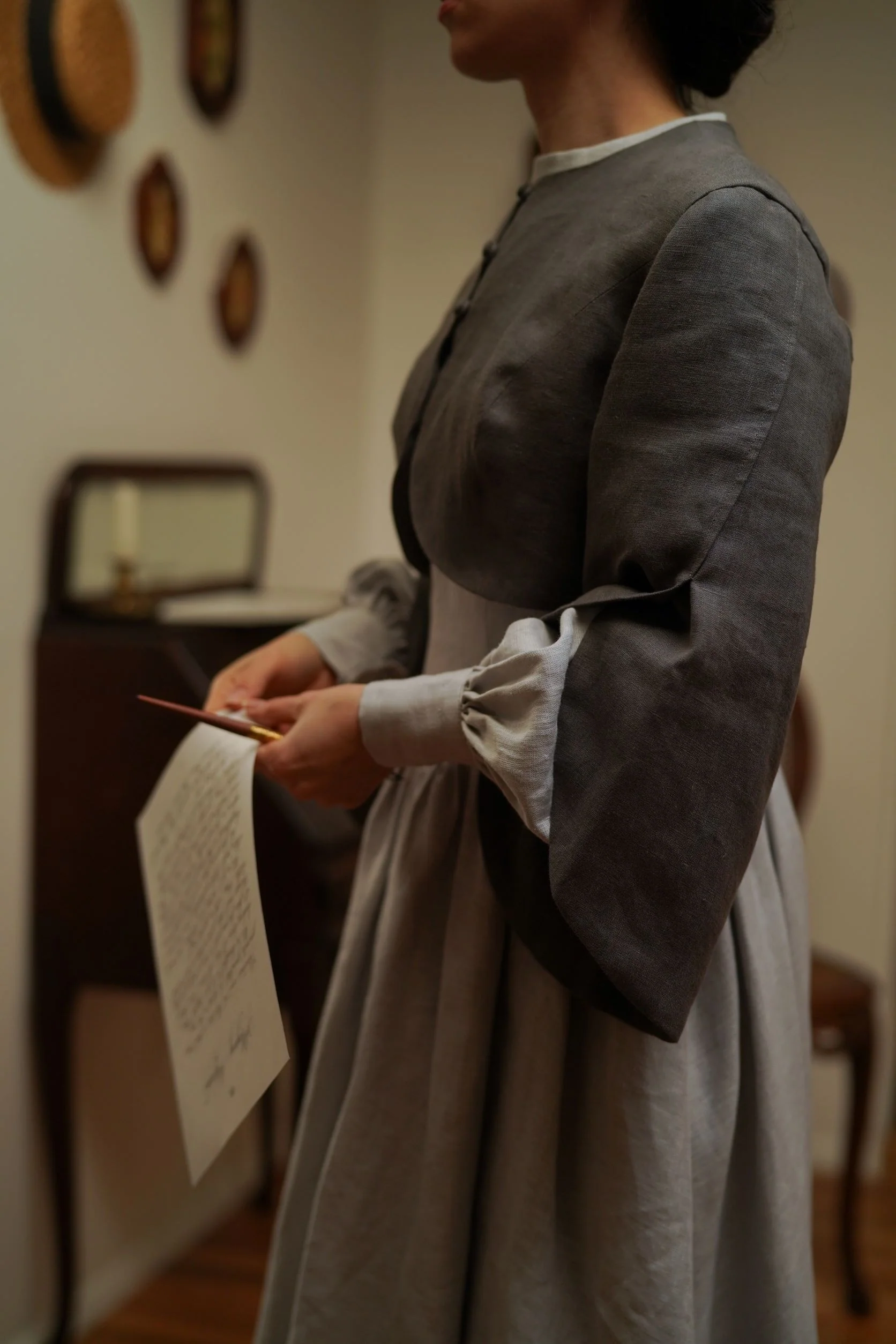 The Jo Bolero - Zouave Jacket - was a highly popular style in the Victorian era, inspired by the character Jo March from the novel "Little Women". It features a round neckline, linen buttons with button loops, and bell sleeves. The versatility of this bolero allows it to be paired with a variety of our dresses and blouses.